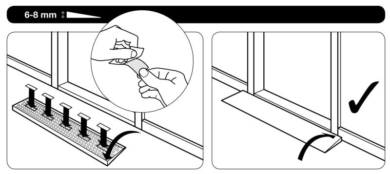 Dörrtröskelramperna är utformade för snabb och enkel installation utan verktyg. Ramper med höjder på 4-8 mm levereras med dubbelhäftande tejp som gör det enkelt att placera rampen framför tröskeln i ett stabilt läge. Tejpen kan tas bort utan att lämna märken eller skada golvet..