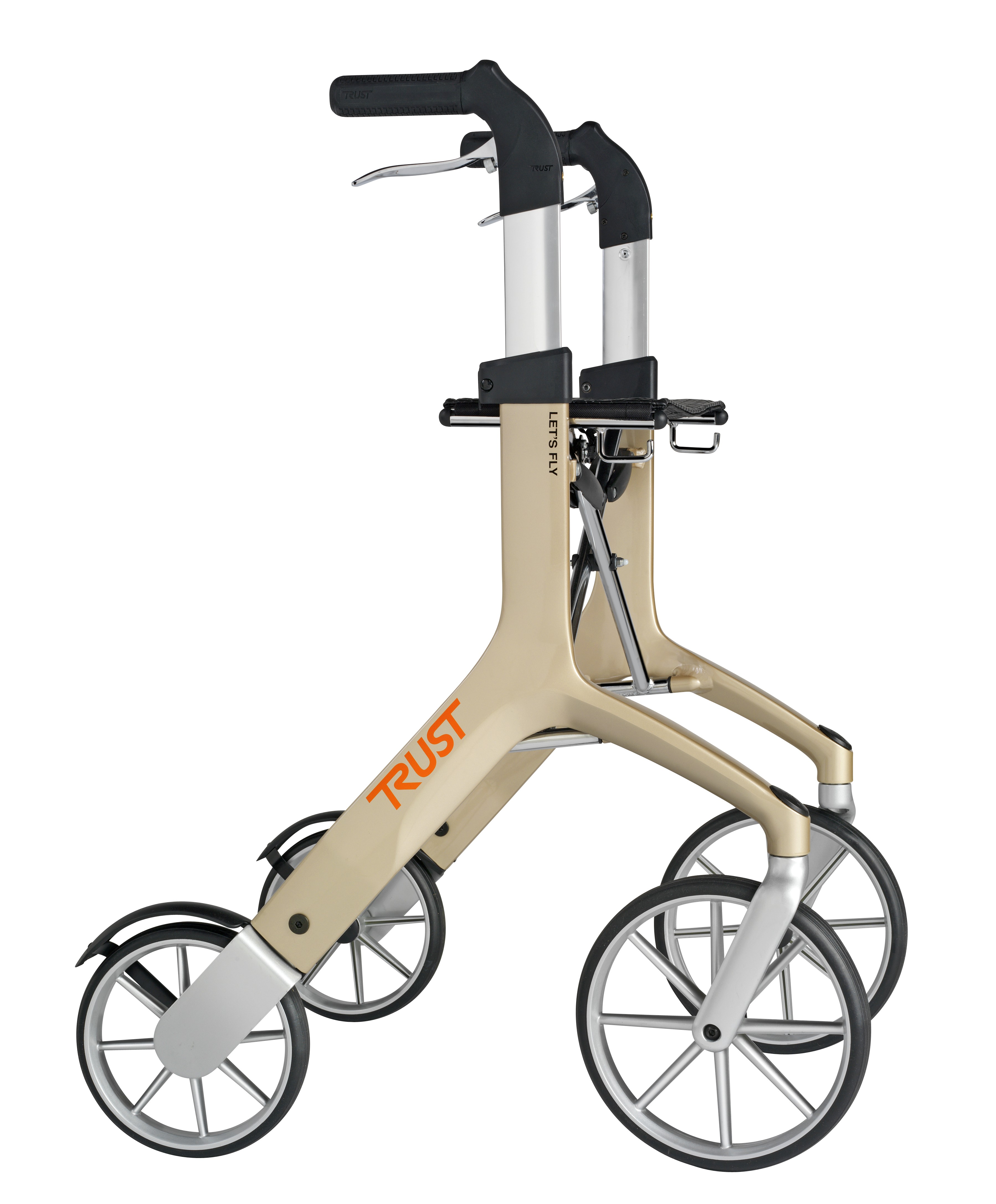TrustCare Let’s Fly är en vidareutveckling av TrustCares Let’s Go Out utomhusrullator, som tidigare satte ny standard för hur elegant en rullator kan vara. Med den nya Let’s Fly rullatorn tänjer TrustCare ytterligare på gränserna för väldesignade produkter genom att presentera Let’s Fly utomhusrullatorn med ram i aluminium utan svetsningar. Den har inbyggd fjädring som tillsammans med de stora hjulen ger en mjuk och behaglig gång.
